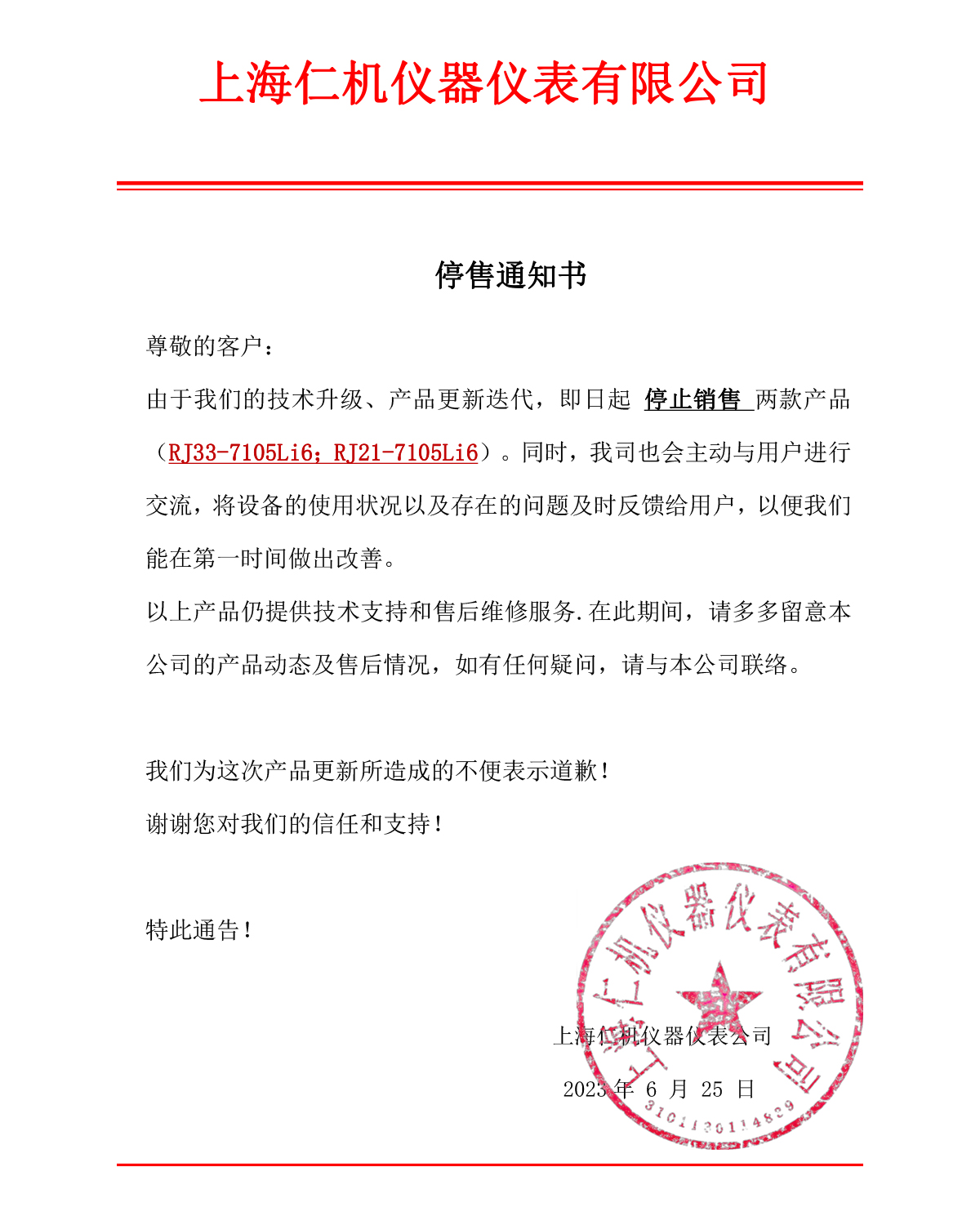 由于我們的技術(shù)升級、產(chǎn)品更新迭代,即日起 停止銷售 兩款產(chǎn)品(RJ33-7105Li6;RJ21-7105Li6)。同時,我司也會主動與用戶進行交流,將設(shè)備的使用狀況以及存在的問題及時反饋給用戶,以便我們能在第一時間做出改善。