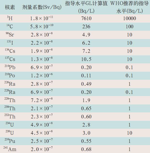 圖 1 現(xiàn)存照射情況下飲用水中主要放射性核素活度濃度指導(dǎo)水平